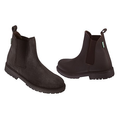 En croûte de cuir vachette huilé. Semelle caoutchouc épaisse et crantée. Soufflet élastique. Semelle et talon antidérapants. Tige et pointe doublées cuir grainé façon porc, pied cuir retourné.