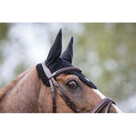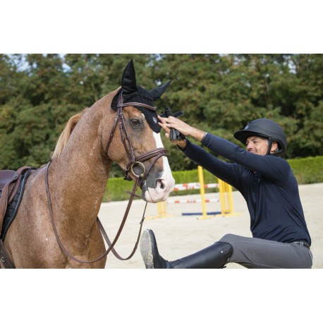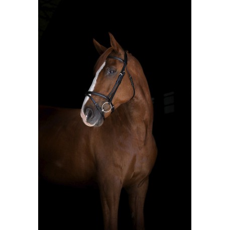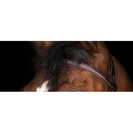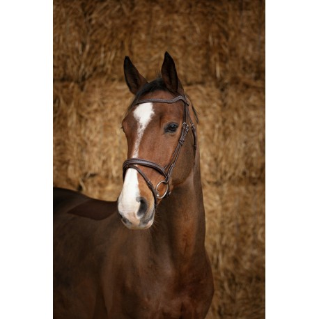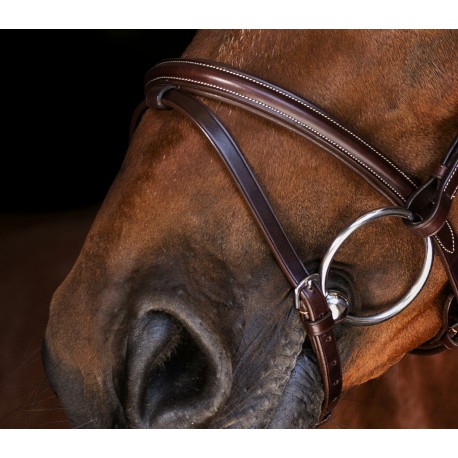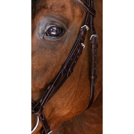 Bridon en cuir vachette italien avec têtière, frontal et muserolle combinée matelassés cuir souple. Crochets sur les montants de mors. Coutures blanches pour le cuir havane et noires pour le cuir noir. Bouclerie en inox. Vendu sans rênes.