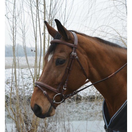 Bridon en cuir aniline. Têtière, frontal et muserolle doublés de clarino microfibre. Insert souple en inox à l’intérieur de la muserolle et de la têtière pour épouser parfaitement la forme de la tête du cheval. Rênes caoutchouc, intérieur de la main de rênes en nylon de 2 millimètres d’épaisseur. Bouclerie en inox.