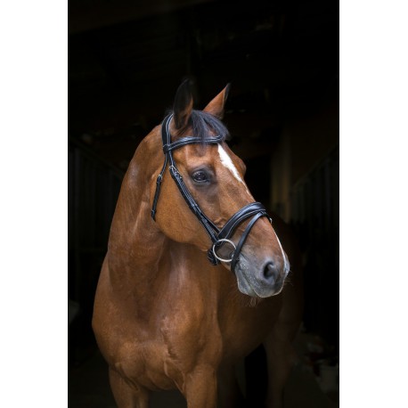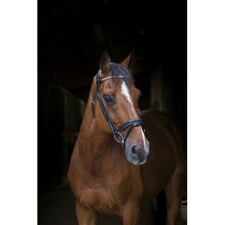 Bridon en cuir de buffle, têtière anatomique large et muserolle combinée doublées cuir vachette souple et matelassé. Frontal avec 3 bandes de strass montées sur une chaînette bombée en laiton. Vendu sans rênes.
