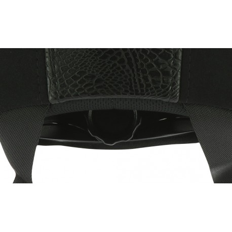Coque recouverte de microfibres, zone médiane recouverte de polyuréthane grainé façon croco, aération frontale noire.