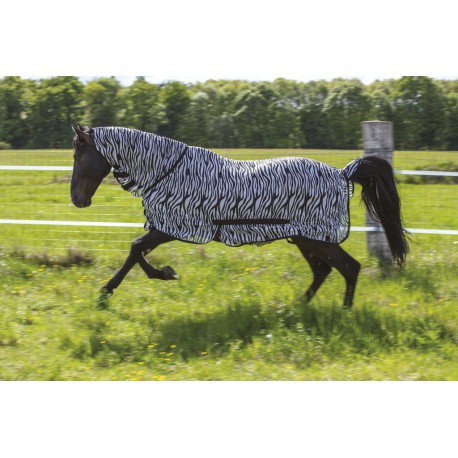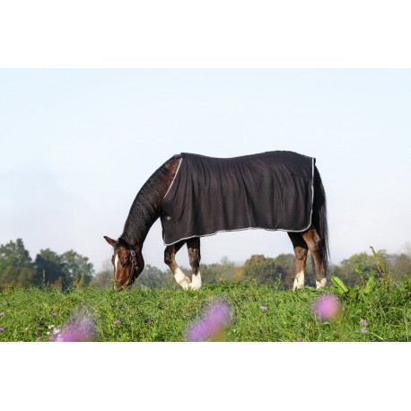 – Couverture avec pli d’aisance grande profondeur, rabat ventral élastiqué, fermeture de poitrail par boucle mâle/femelle en métal chromé et bande auto-agrippante.
