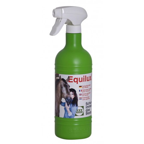 Ce produit exceptionnel permet la toilette rapide de la robe, de la peau, de la crinière et de la queue en quelques minutes. Même les taches d’urine sur les chevaux gris disparaissent. EQUILUX® est prêt à l’emploi et sèche vite. Il n’est pas utile de mouiller la robe ce qui permet son utilisation en hiver. Les produits qu’il contient donnent de l’éclat à la robe et la préservent de la poussière. Il est composé presque entièrement de produits naturels et ne nuit pas à l’environnement. Très pratique il est également disponible en stick pour ne pas effrayer les chevaux nerveux ou craintifs et permet ainsi d’éliminer les taches sur la tête du cheval, comme par exemple le contour des yeux.