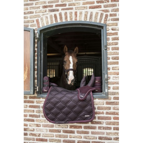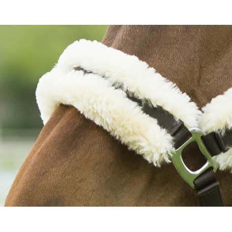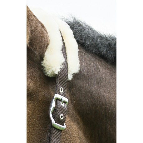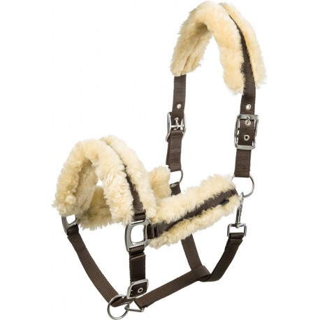 En polypropylène double épaisseur au toucher doux, avec têtière, montants et muserolle doublés mouton synthétique. Têtière avec double réglage à boucles et œillets de renfort. Fermeture rapide de la sous-gorge par mousqueton. Bouclerie massive en métal nickelé.