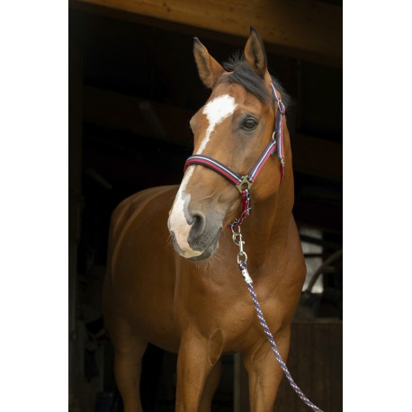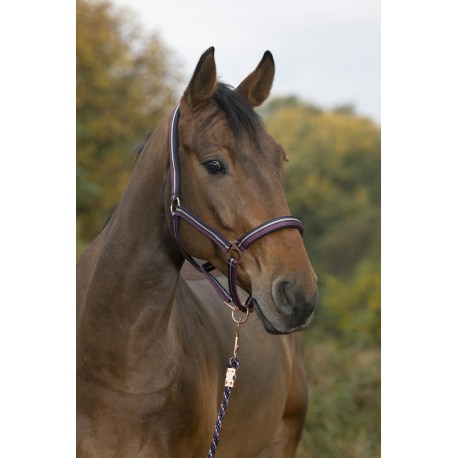 En nylon double épaisseur avec muserolle et têtière réglables doublées néoprène. Ouverture rapide de la sous-gorge par mousqueton. Bouclerie en métal coloris chromé ou or rose. Accompagné d’une longe d’attache de 2,50 m.