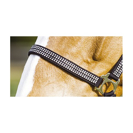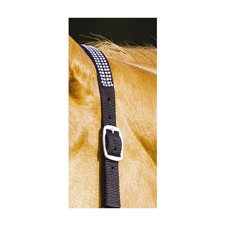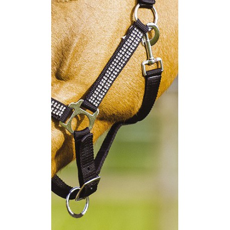En polypropylène double épaisseur avec têtière et muserolle réglables par boucles. Têtière, montants et muserolle rehaussés de 4 rangées de strass transparents en incrustation. Ouverture rapide de la sous-gorge par mousqueton. Bouclerie en métal nickelé. Disponible uniquement en noir taille poney