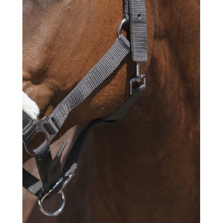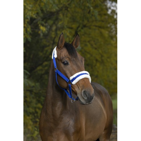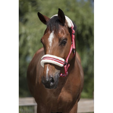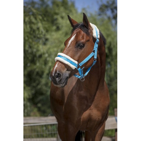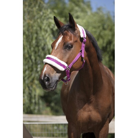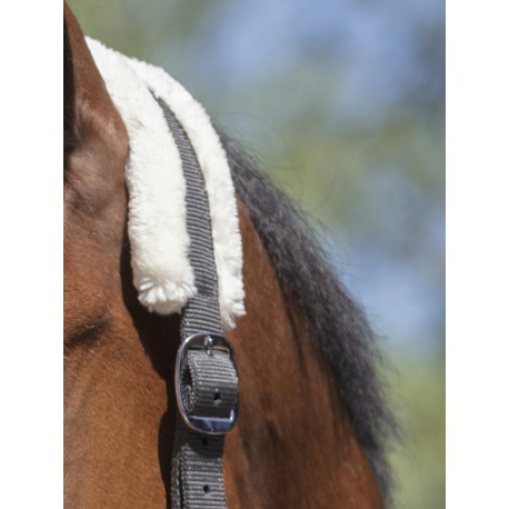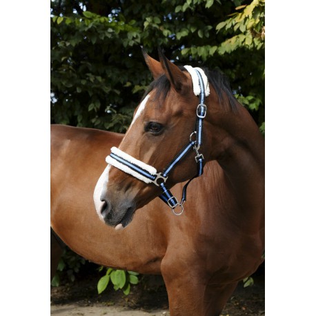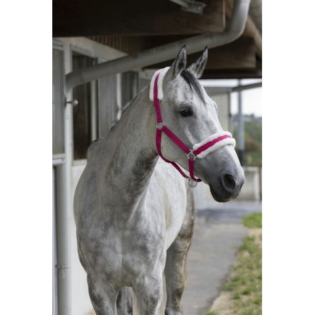 En polypropylène double épaisseur avec têtière et muserolle réglables par boucles, doublées mouton synthétique beige. Fermeture rapide de la sous-gorge par mousqueton. Bouclerie métal.