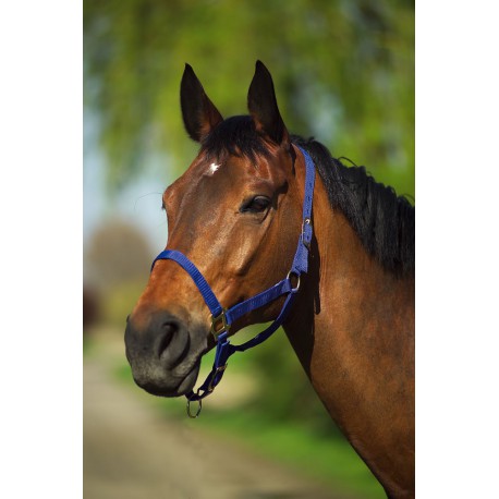 En polypropylène double épaisseur avec têtière et muserolle réglables par boucles. Bouclerie métal jaune.