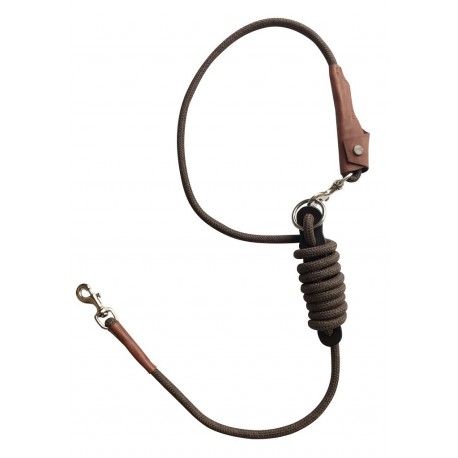 Longe de randonnée en polypropylène avec renfort en cuir vachette aux deux extrémités. Mousquetons tournants en laiton massif nickelé à chaque extrémité. Anneau d’attache en inox. Taille : 3 mètres