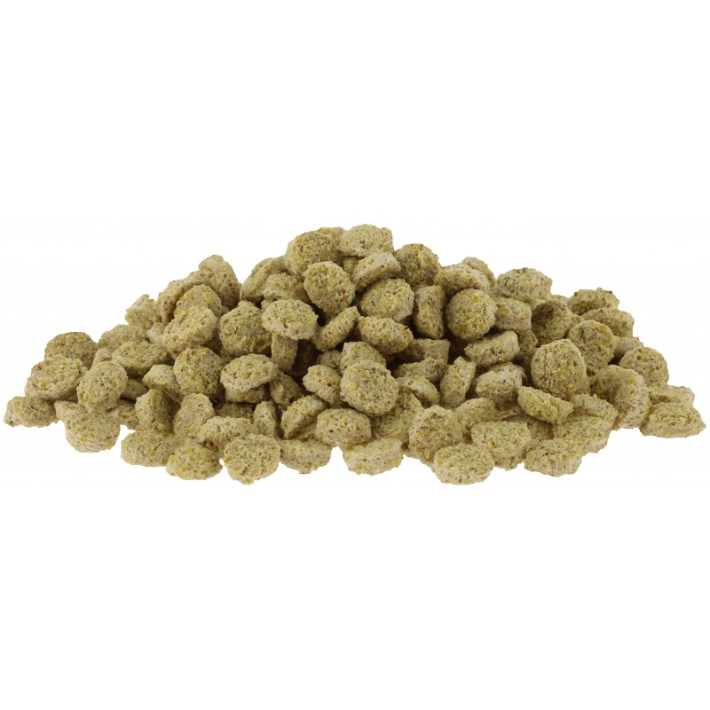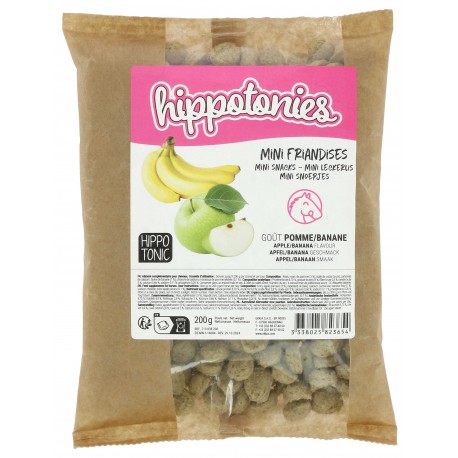 Composition : Maïs, marc de pomme (3 %), huile de colza (brute), carbonate de calcium, farine de banane (1 %), chlorure de sodium, morceaux de pomme séchés (0,1 %).