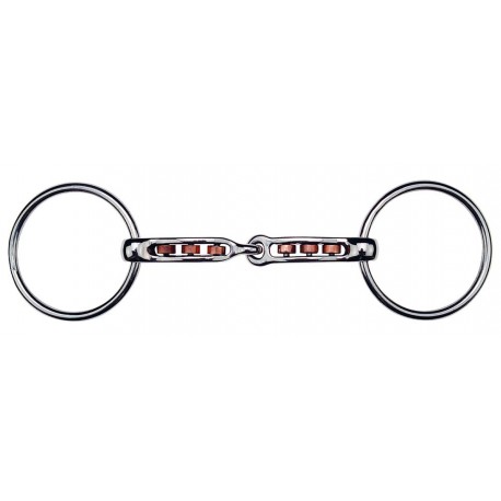 En inox avec rouleaux en cuivre décontractants. Les bords francs des canons incitent les chevaux à ne pas trop s’appuyer. A utiliser avec une main douce. Epaisseur du canon : 17 mm, Diamètre des anneaux : 75 mm, Canons : pleins
