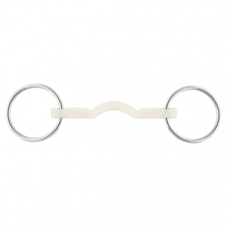 Mors deux anneaux 18 mm double brisure – Thermoplast blanc. Les articulations en plastique antiallergique se placent discrètement dans la bouche du cheval, pas de glissement latéral. Epaisseur du canon : 18 mm