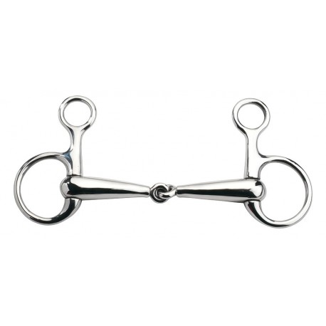 En inox avec double brisure anatomique. Facilite le basculement de la nuque et le « placer » par un léger effet de levier. Il permet de redresser les chevaux qui chargent un peu trop les épaules. Epaisseur du canon : 17 mm, Diamètre des anneaux : 45 mm, Canons : pleins