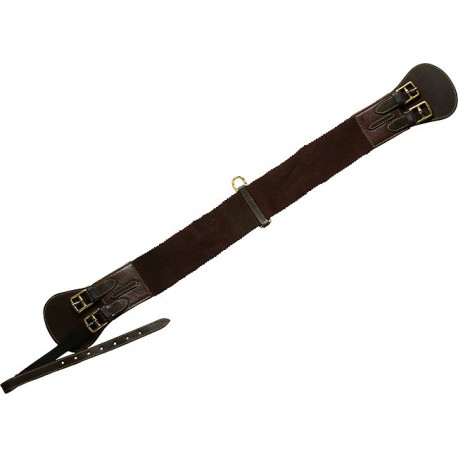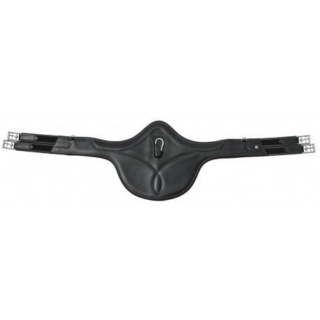 Sangle bavette en cuir de buffle avec doublure en cuir vachette. Triple élastique de chaque côté. Mousqueton au milieu et 1 anneau de chaque côté. Boucles rouleaux inox montées sur élastiques triple épaisseur des deux côtés.