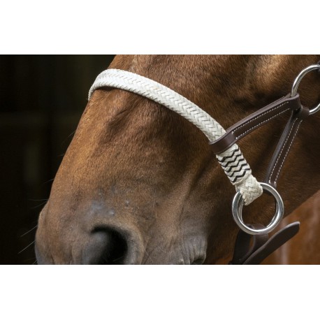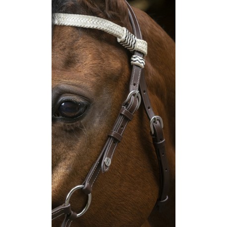 Side-pull en cuir de buffle. Frontal et muserolle souples en cuir tressé. Boucle en inox. Vendu sans rênes.