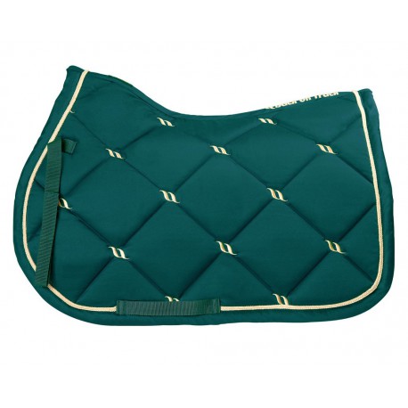 Tapis de selle 100 % polyester avec pad de garrot en mouton synthétique et galon torsadé.